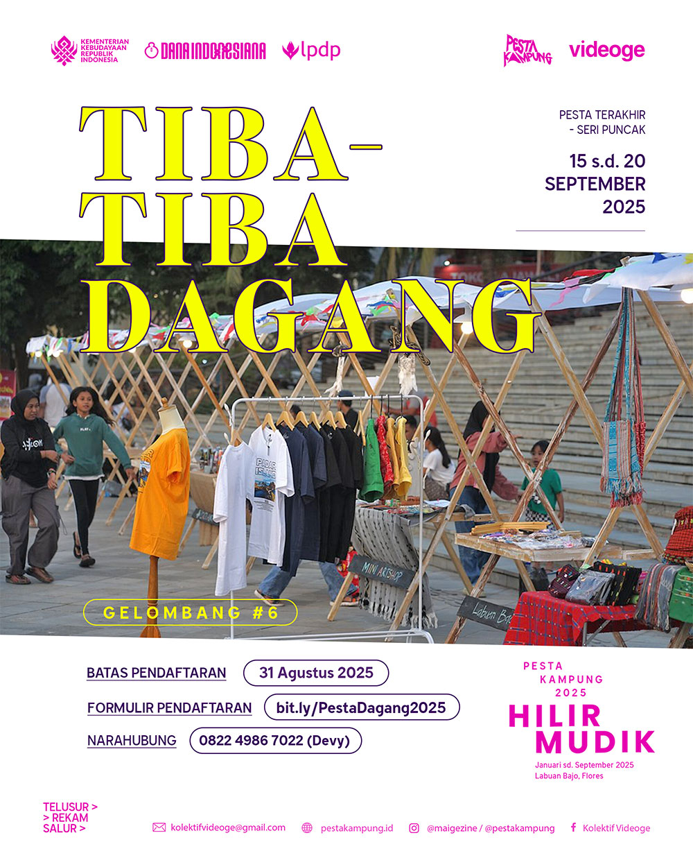 Tiba-tiba Dagang adalah program lapakan kreatif secara rutin digelar di Pesta Kampung yang membuka kesempatan ruang bersama untuk berjualan. Tahun ini tersedia 20 tenant terpilih. Kami mencari ibu- ibu yang memiliki dagangan dan orang muda kreatif yang produknya unik, layak jual, serta pelapak yang baru mencoba melapak di festival.